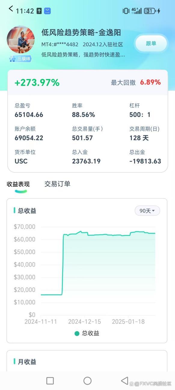 在FXVC风投社区APP上,投资者可以随时随地选择各种类型的策略信号源进行跟单,并实时查看信号源的交易情况,优化自己的投资决策。同时,账户页面也会展示每笔跟单的最新收益情况,便于投资者及时处理交易订单。